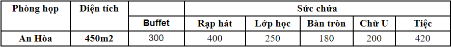 Với sự đa dạng về sắp xếp và bài trí, thiết bị hiện đại, dịch vụ ăn nghỉ phong phú và  phục vụ chuyên nghiệp.Phòng họp An Hòa có thể đảm bảo sự thành công cho những sự kiện quan trọng.
