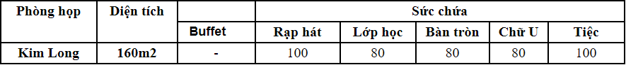 Phòng họp Kim Long nằm ở tầng 11 của khách sạn. Nơi đây phù hợp với các cuộc họp có số lượng khách từ 30-110 người. Có cách set up khác nhauhình chữ U, lớp học, nhà hát,…Với đầy đủ trang thiết bị tối tân và đội ngũ nhân viên chuyên nghiệp, nhiệt tình.