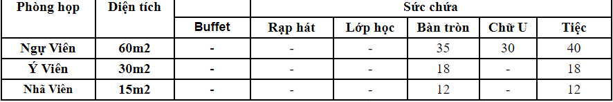 Các phòng họp nhỏ Ngự Viên, Ý Viên, Nhã Viên có sức chứa từ 10 – 40 khách.Nơi phù hợp với các cuộc họp nhỏ hoặc các bữa tiệc chiêu đãi thân mật.