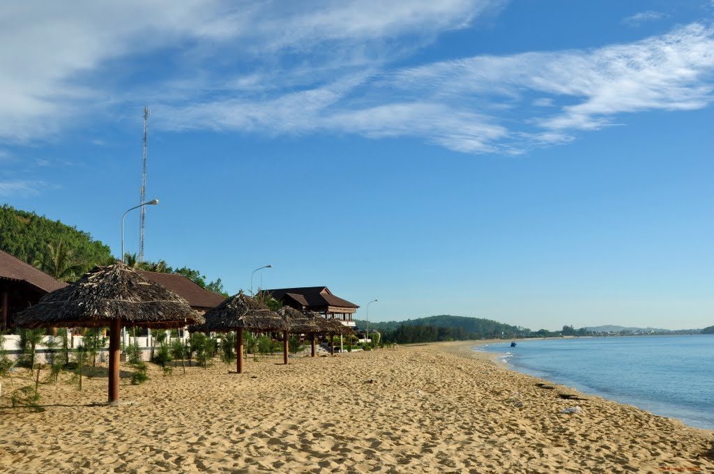 Bãi biển Sa Huỳnh thơ mộng và còn đậm nét hoang sơ, chạy dài khoảng 5km, cong cong hình lưỡi liềm, với nét quyến rũ của triền cát vàng óng ả và mềm mịn, điểm xuyến những thảm cỏ xanh, hoa dại, cùng hàng dương đã nhiều năm tuổi, vẫn ngày đêm rì rào theo gió… như mời gọi lữ khách gần xa.
