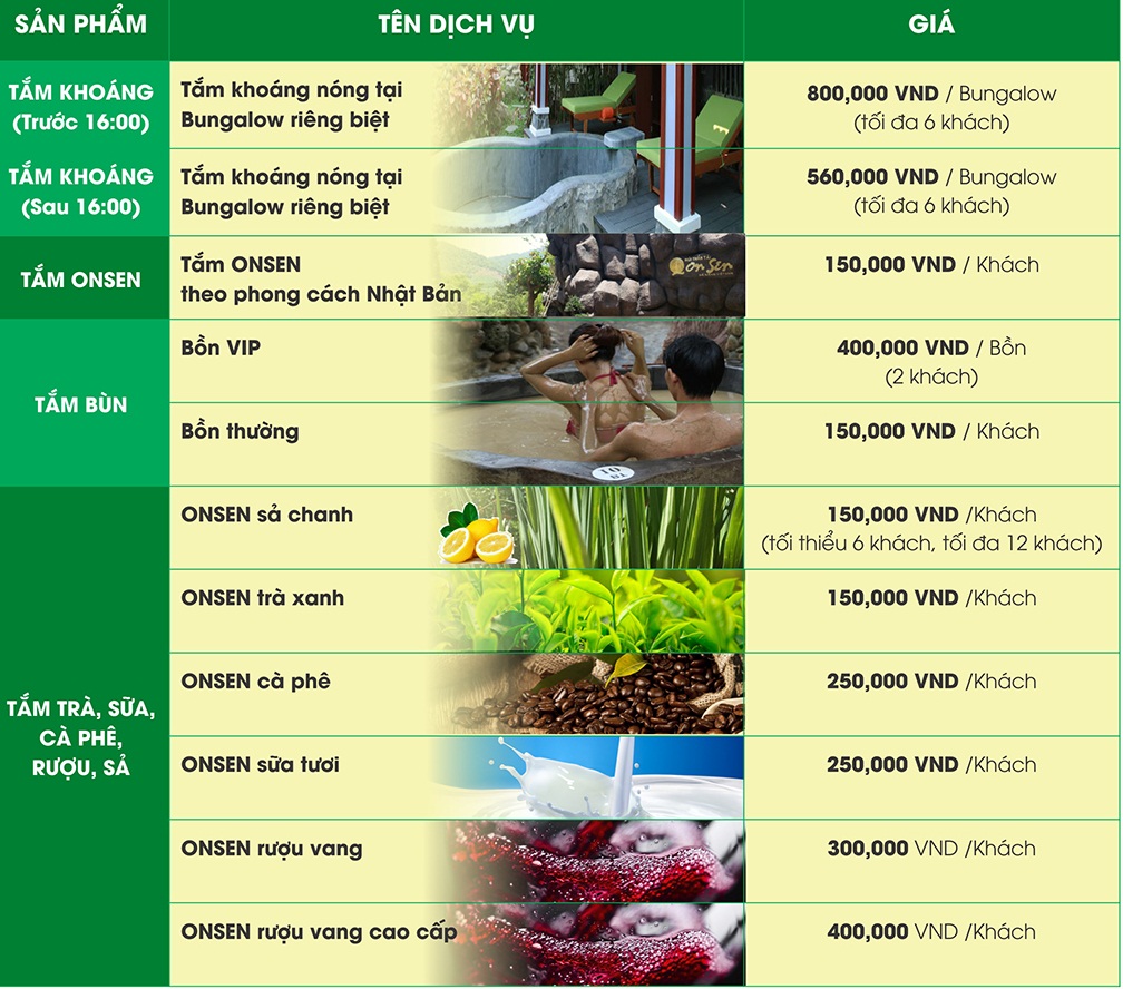 • Tắm khoáng tại Long Huyệt Hồ và các hồ tự nhiên, Xông hơi khô và xông hơi ướt, Massage tại hồ sục Jacuzzi, Tham quan mỏ khoáng phát lộ, Ngâm chân tại điểm phát lộ, Vui chơi tại bể bơi, Trượt phao dòng sông Lười, Vui chơi tại Công viên nước.