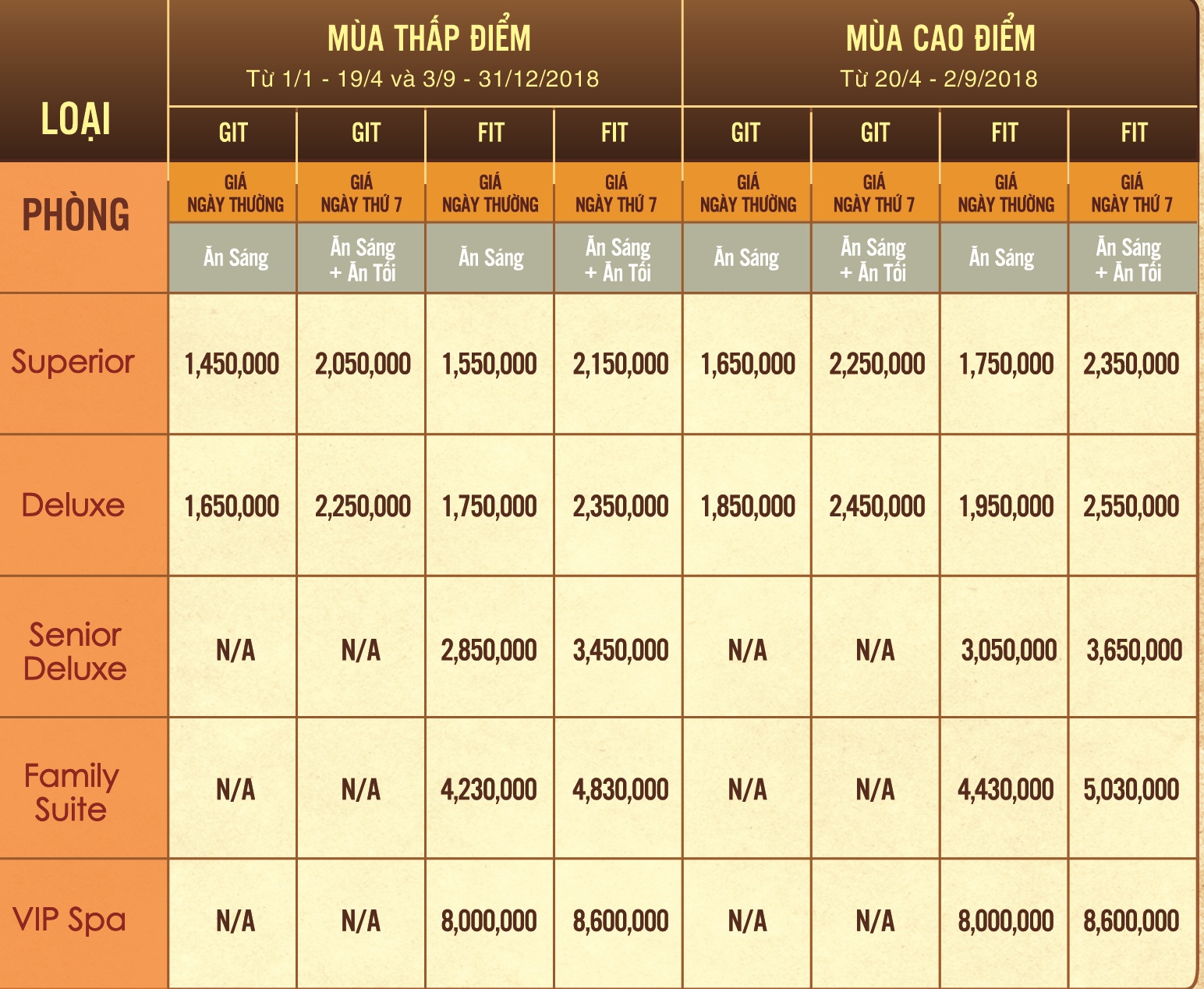 Bảng giá phòng: