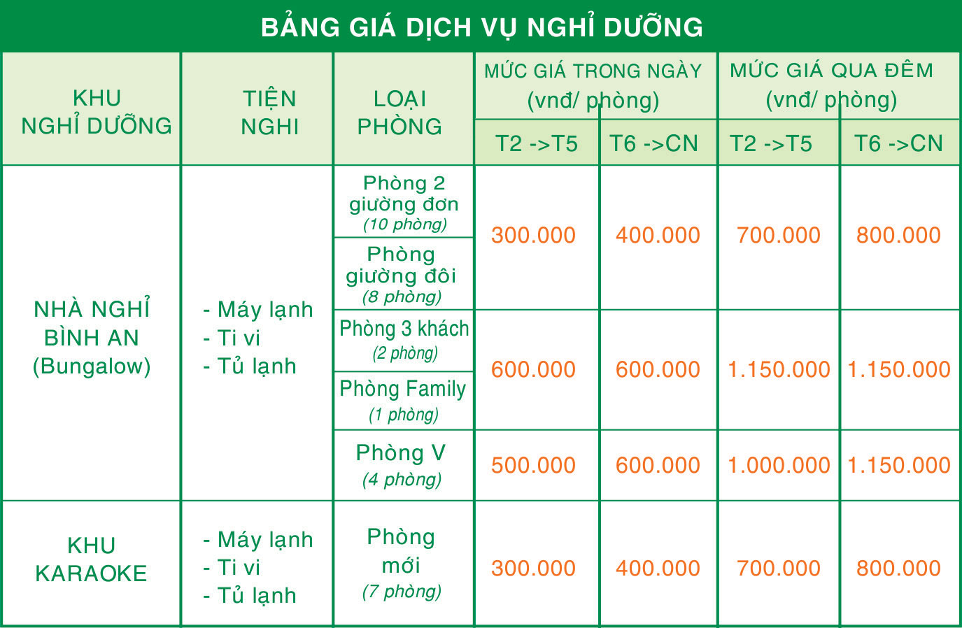 • Bungalow: có tổng cộng 32 phòng khách sạn, 4 phòng V cao cấp, 1 phòng tập thể tiện nghi và nội thất đầu đủ như: tủ lạnh, máy lạnh, vi vi, máy nước nóng lạnh, wifi free.
