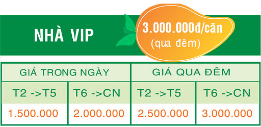 • Nhà VIP: Từ 4 đến 6 thành viên có thể lựa chọn khu nhà VIP hai tầng lầu riêng biệt đầy đủ tiện nghi như: tủ lạnh, máy lạnh, tivi, máy nước nóng lạnh, wifi free ( bàn ghế ngoài trời để tiếp khách, hồ bơi mini riêng, có bếp nấu ăn riêng cho gia đình).