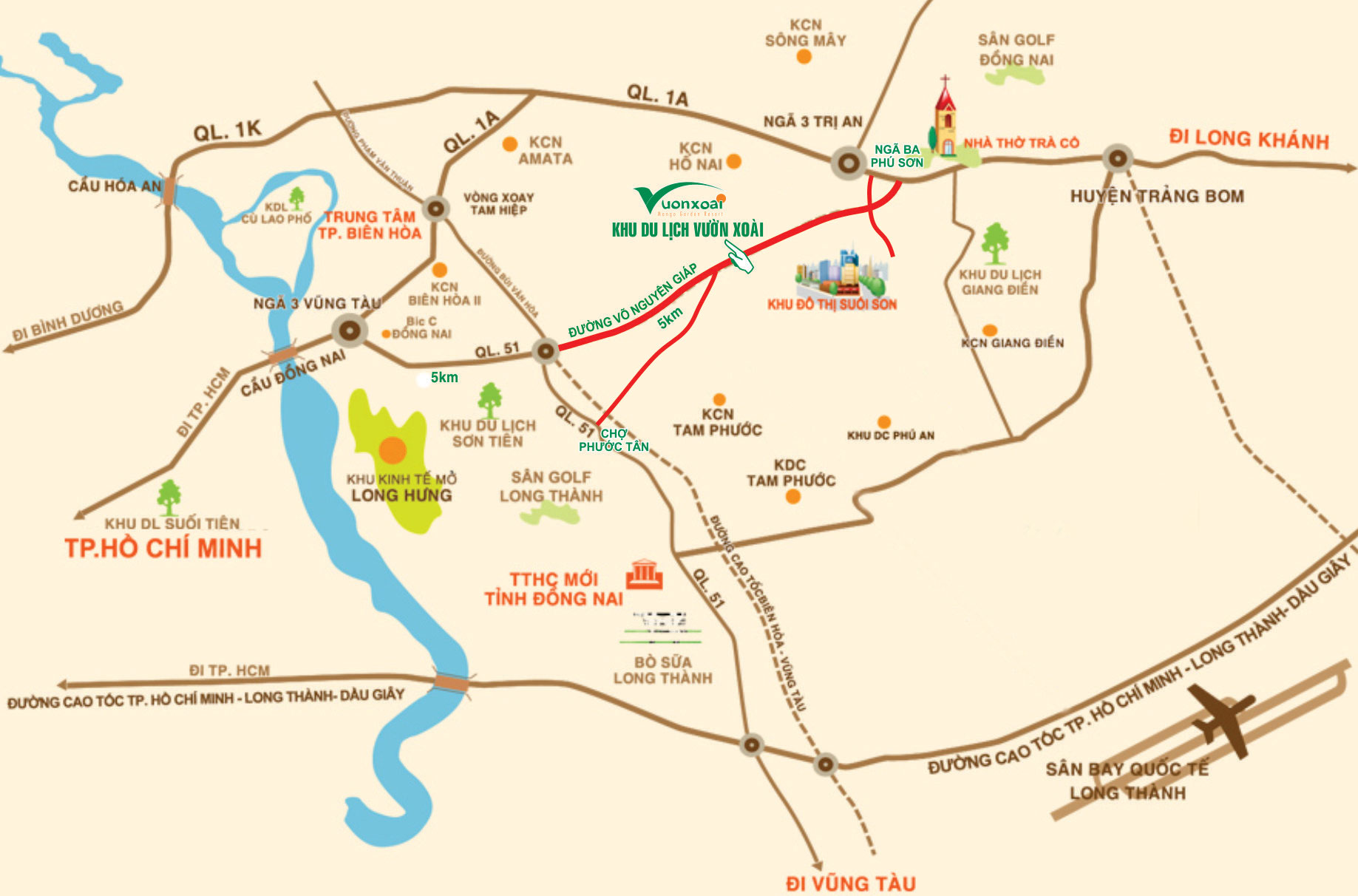 Ô tô, xe máy: Từ cầu Sài Gòn, theo xa lộ Hà Nội, ra khỏi Sài Gòn – qua cầu Đồng Nai – đến ngã Ba Vũng Tàu – quẹo phải đi theo quốc lộ 51 – đi thẳng qua đường Võ Nguyên Giáp (đường tránh thành phố Biên Hòa) – đi khoảng 7km nữa là đến đường Đinh Quang Ân ngay Khu du lịch Vườn Xoài.