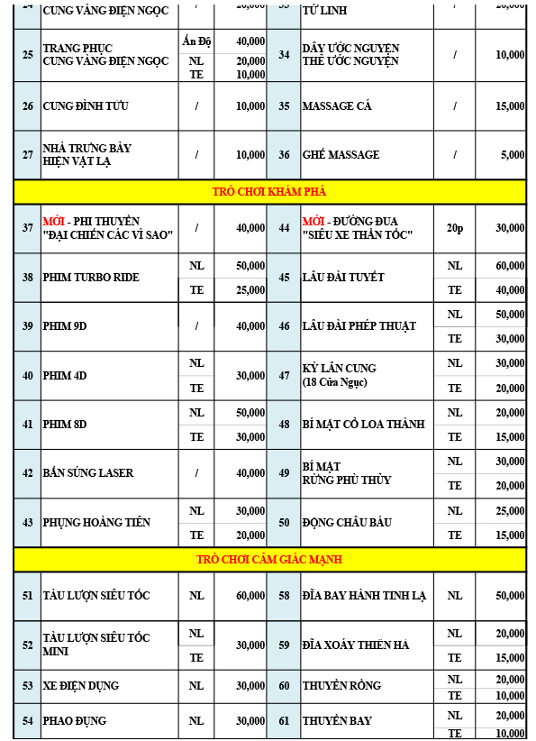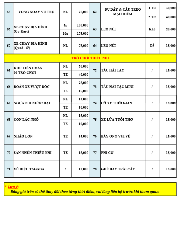 - Các trò chơi cảm giác mạnh có sẵn tại Khu du lịch như: tàu lượn siêu tốc, vòng xoay vũ trụ, cối xoay thần gió, xe vượt địa hình, đĩa xoáy thiên hà, đu dây mạo hiểm, leo núi…