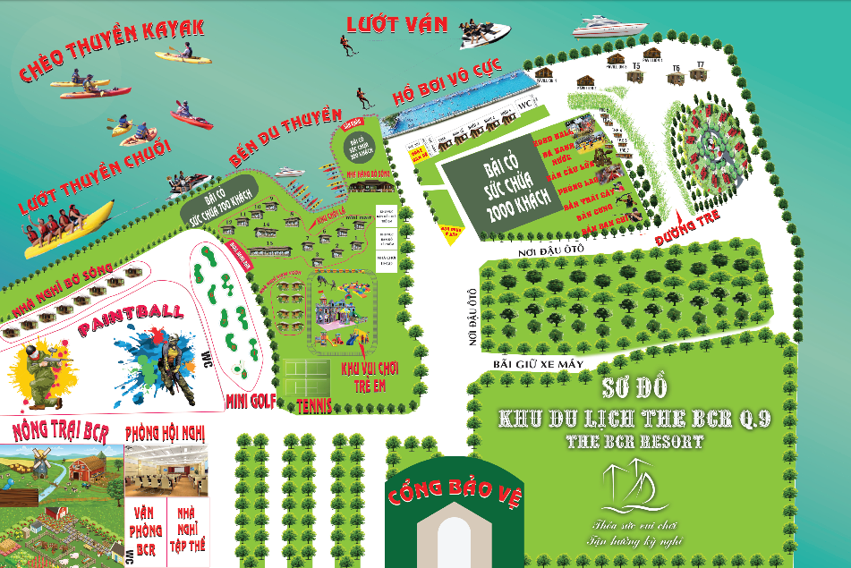 Khu Du Lịch The BCR là khu du lịch nghỉ dưỡng, vui chơi giải trí dành cho những ai yêu thích thiên nhiên sông nước, thể dục thể thao vận động ngoài trời như: bắn súng sơn, bắn súng nước, bắn trái cây, bắn cung, bắn đạn chì, hồ bơi sát sông, nhà hàng sát sông, chèo thuyền kayak, bắt cá tay không, khu mini golf, nông trại thực nghiệm, smashdown, zord ball, tennis, câu cá, phòng hội nghị, phòng nghỉ Bungalow, cắm trại, khu shopping, khu vui chơi thiếu nhi ngoài trời,…