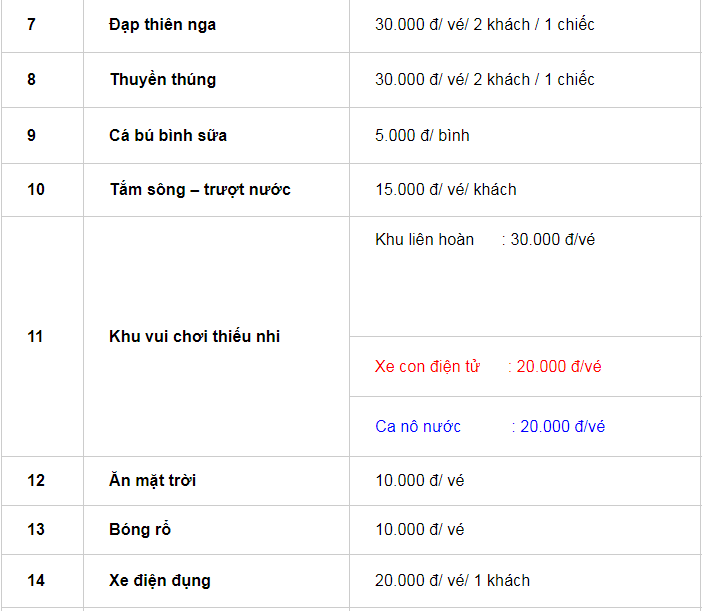 • Các trò chơi tại Khu du lịch: Cưỡi đà điểu Châu Phi, Bóng nước, Trượt cỏ, Đua thuyền thúng bắt vịt, Nghe đàn ca tài tử, Xem hát bội, Khu trò chơi dân gian, Câu cá sấu, Đạp thiên nga, Tắm sông – trượt nước, Khu vui chơi thiếu nhi, Chèo xuồng ba lá, Câu cá giải trí, Karaoke bầu hồ lô, Chụp hình hóa trang, Bắn cung …