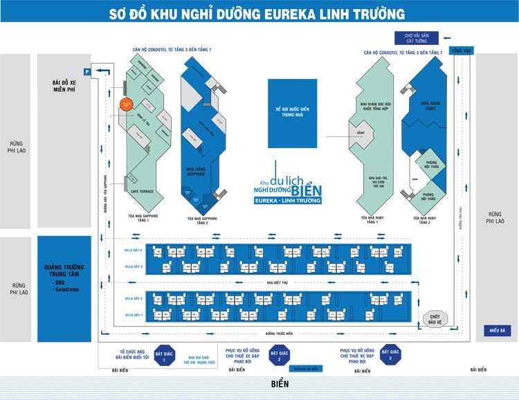 Khu nghỉ dưỡng Eureka – Linh Trường được xây dựng trên diện tích hơn 6ha trong tổng khu du lịch hơn 40ha, bao gồm 72 biệt thự song lập sang trọng, và hơn 90 căn hộ hiện đại với đầy đủ tiện nghi. Tất cả công trình kiến trúc ở đây đều hướng ra biển. Gió biển Đông phóng túng cùng với thảm rừng xanh chạy dài dọc bãi biển giúp du khách có những ngày nghỉ dưỡng thú vị và sảng khoái nhất. Eureka – Linh Trường không chỉ là khu nghỉ dưỡng mà còn là ngôi nhà hạnh phúc thứ hai, là nơi các gia đình sum họp, quây quần, là địa chỉ của những đôi uyên ương muốn tìm đến sự lãng mạn và là nơi tụ họp, chia sẽ niềm vui cùng những người thân và bạn bè thân thiết.