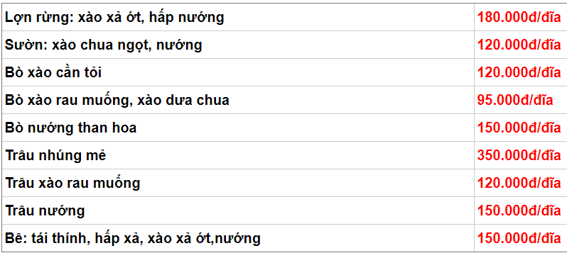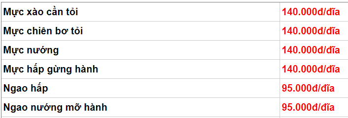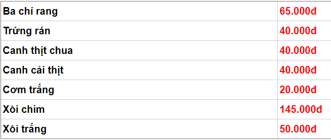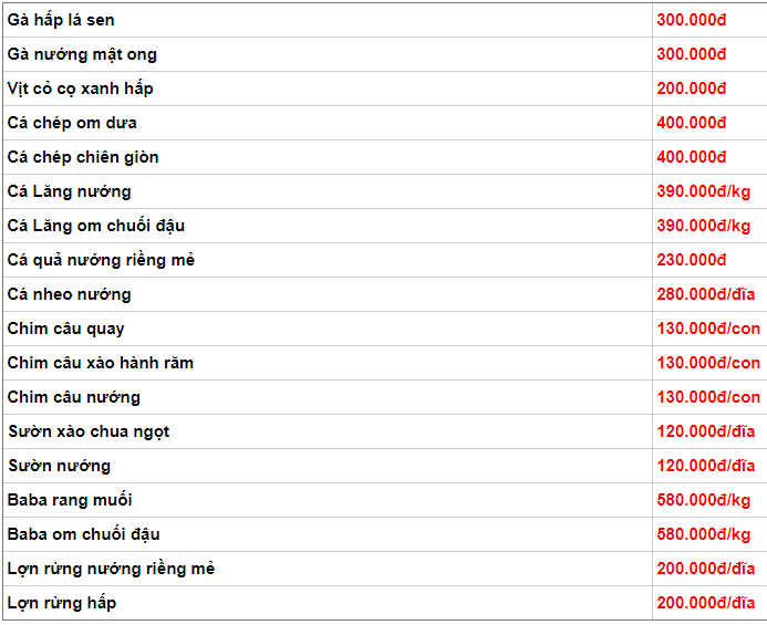 - Theo set menu: từ 1.040.00 VND/mâm đến 1.455.000 VND/mâm.