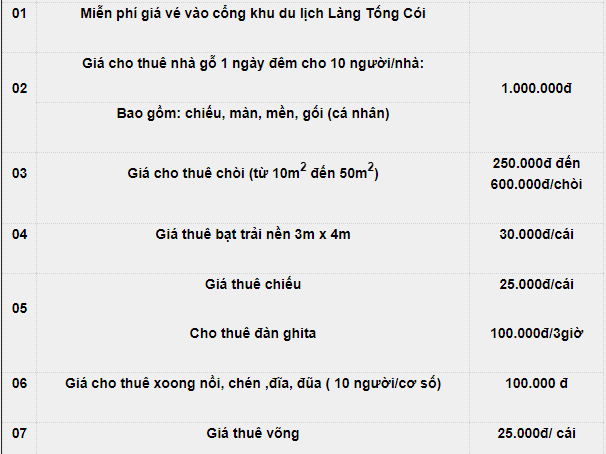 Ngoài ra, làng du lịch Tống Cói còn được khách tới tham quan đặt biệt danh khá dễ thương là làng ba không: không phục vụ (nghĩa là tự phục vụ), không rác (khách tham quan tự ý thức giữ gìn vệ sinh) và không bóng người (vắng vẻ, yên tĩnh). Ở làng có khu bếp và khu nhà ăn sinh hoạt rộng rãi, hòa mình với thiên nhiên xung quanh. Tuy nhiên, chúng mình khuyến khích các bạn tự túc mang theo thức ăn và các gia vị cần thiết nếu có ý định nấu ăn vì làng không hỗ trợ bán phụ gia, chỉ hỗ trợ cho thuê chén nồi thôi nhé.