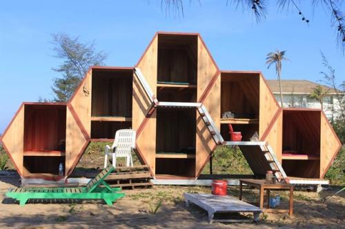 Điều thu hút nhất khi đến Lu Glamping chính là khu nhà ở kén tổ ong độc đáo nằm san sát nhau, được làm từ gỗ tạp. Với diện tích khoảng 3m 2 , trong mỗi kén tổ ong bố trí 1 chiếc nệm nằm vừa 2 người lớn và các vật dụng cần thiết khác, sẽ là nơi ngủ vùi lý tưởng cho những ai thích khám phá. Dự kiến hơn 100 kén sẽ hình thành trải dài chẳng khác nào một chung cư hiện đại và vô cùng lãng mạn. Nếu bạn muốn tìm một không gian biệt lập, yên tĩnh thì hệ thống lều đủ màu sắc được đặt sát bờ biển sẽ đem lại cảm giác vô cùng thú vị. Ngả lưng tại đây, bạn tha hồ hít thở gió biển, nghe sóng vỗ, cảm nhận từng nhịp thở của biển cả mênh mông và quên đi mọi muộn phiền. Để đạt tiêu chí khu cắm trại dã ngoại gần gũi thiên nhiên, tiện nghi và hiện đại, Lu Glamping còn thiết kế một hệ thống phòng ở container có máy lạnh vô cùng tao nhã.