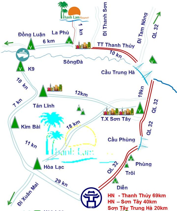 - Hà Nội —— Quốc lộ 32 —— Sơn Tây —— Cầu Trung Hà ——Thạch Lâm, Thanh Thủy.