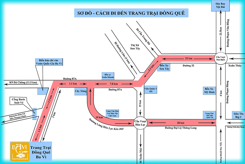 Di chuyển theo hướng Đại Lộ Thăn Long: Quý khách di hết đại lộ thăng Long, di chuyển lên cầu, đi thêm 16km đến cây Xăng nơi có đèn giao thông, rẽ trái đi khoảng 1km thấy biển chỉ dẫn và đi thêm 3km sẽ tới Trang trại đồng quê.