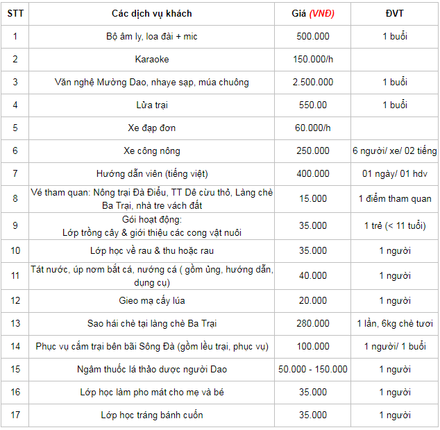 Bảng giá dịch vụ ăn ở, sự kiện tại Trang trại đồng quê Ba Vì – Hà Nội