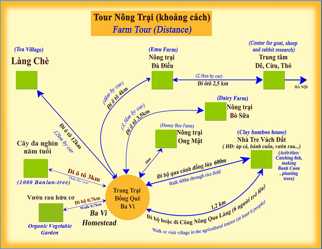 Cấy lúa, bắt cá cua ốc bằng những dụng cụ làm bằng tre, trồng và hái các loại rau rừng và rau thảo dược, xem cách làm mật ong, tự hái và sao chè khô, tham quan trang trại đà điểu, dê, thỏ, bò sữa, tour làm bánh cuốn, tour học gói bánh chưng và nấu Phomat từ sữa Bò tươi Ba Vì, tour làm bác nông dân nhí …