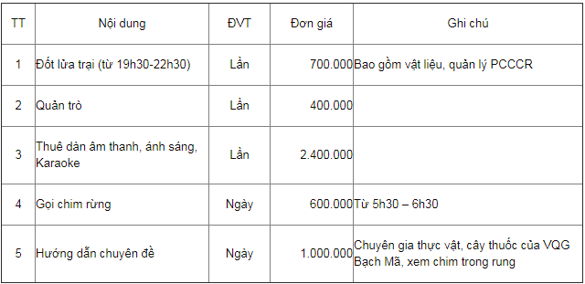 - Dịch Vụ cắm trại: Phí 30.000 đ/người, quý khách tự mang theo lều trại.