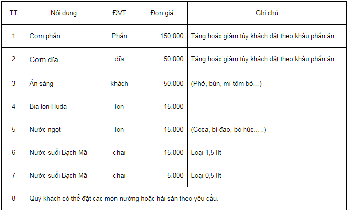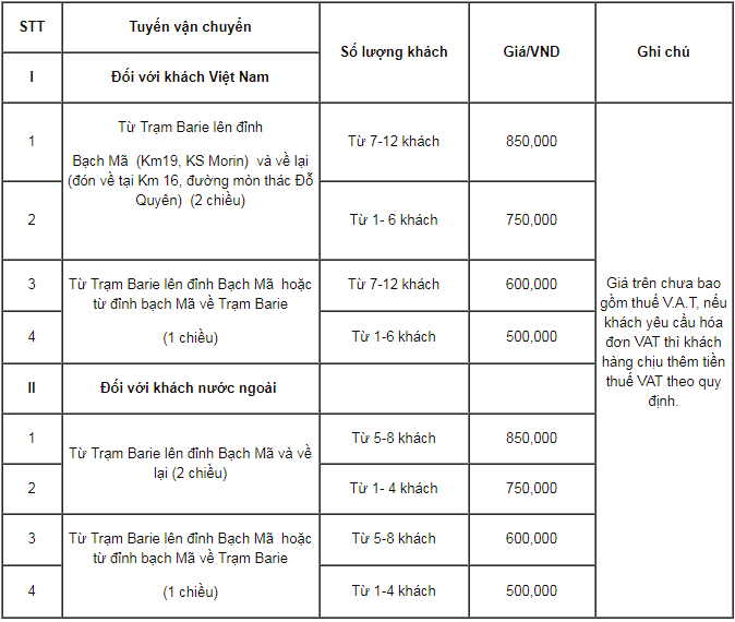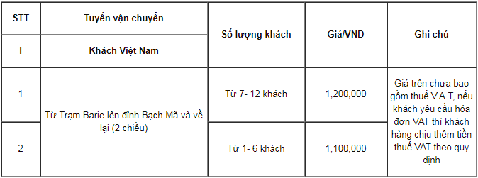 Bảng giá dịch vụ vận chuyển đi đỉnh Bạch Mã: